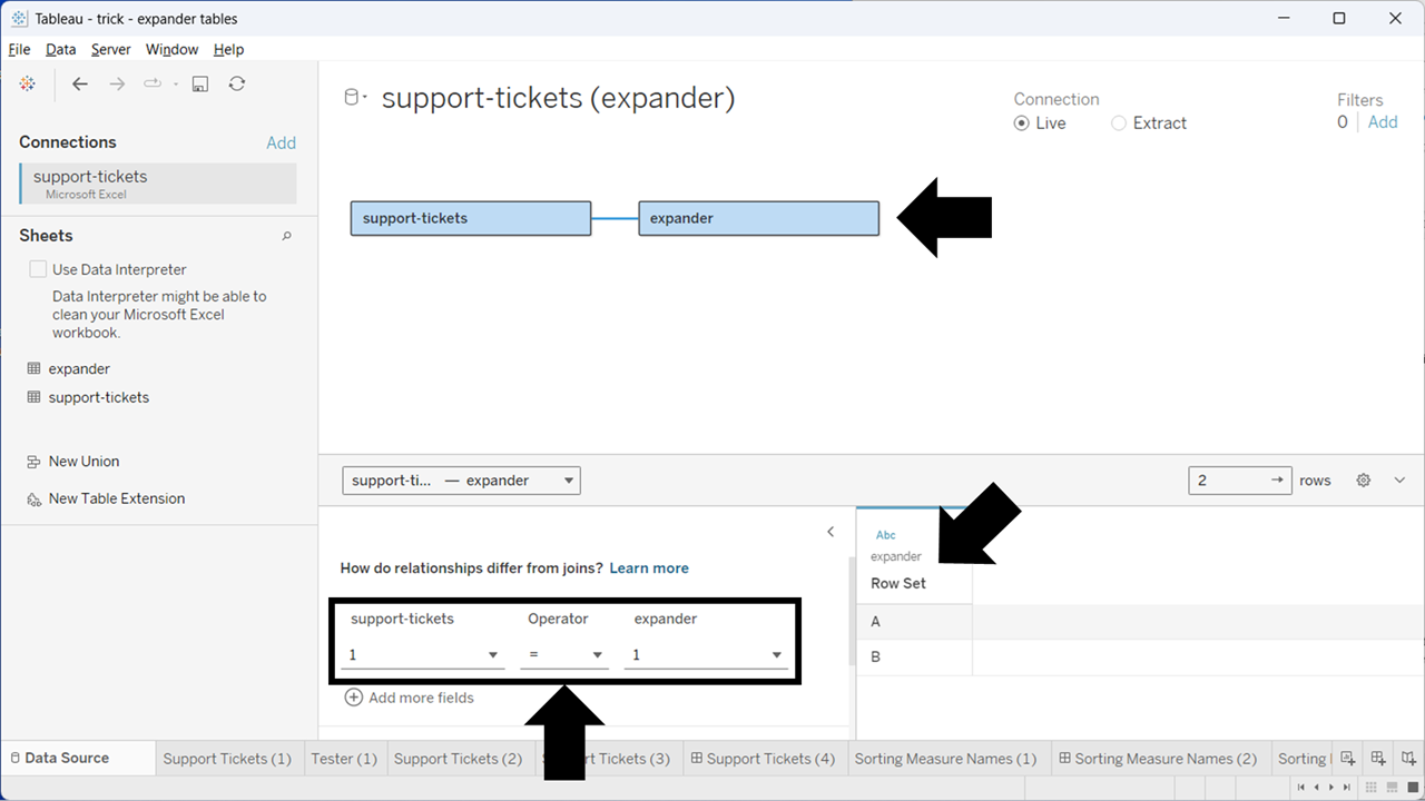 Here I have related an “expander” table onto the support tickets (top black arrow); the expander table has two rows in it (Row Set A and B, highlighted with the diagonal arrow); and the relationship is on a relationship calc of 1=1, which is always true (bottom arrow, note: you choose “relationship calc” in the drop downs here and then enter 1 for each).
