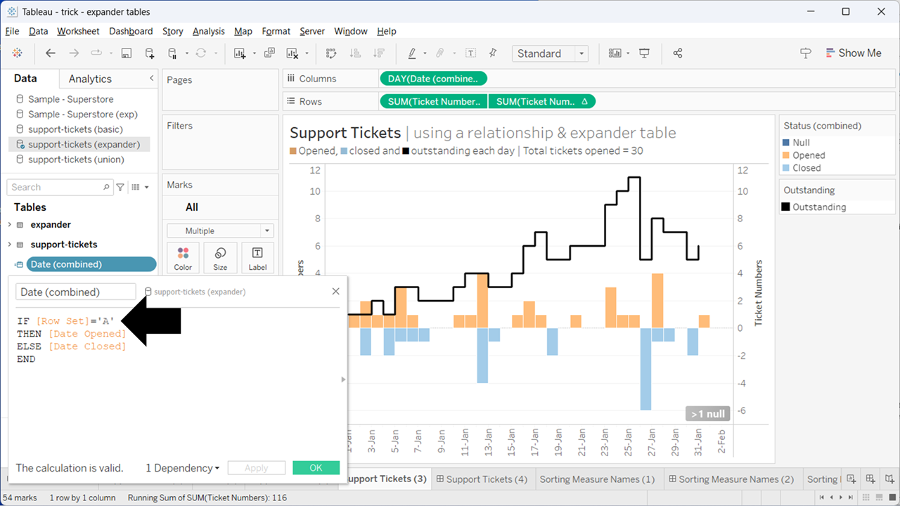 Here I build a combined date. When the Row Set is A, the date will be the date opened. And when the Row Set is B, it will be the date closed. I also create a similar calc for Ticket Numbers: +1 when a ticket was opened (Row Set A), and -1 when a ticket was closed (Row Set B where status is closed):