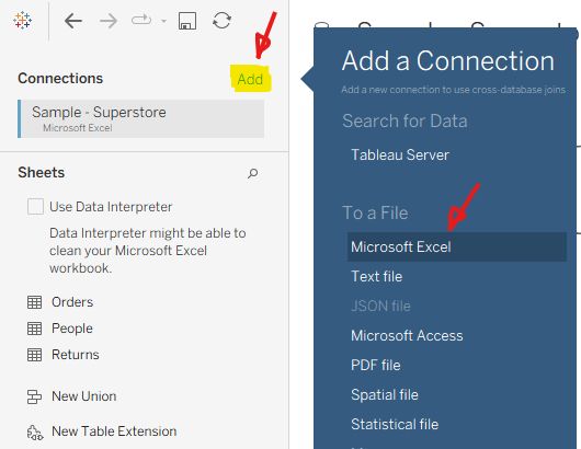 The union (first black arrow) gives you two copies of the data, differentiated by two new fields – Sheet and Table Name (second black arrow).